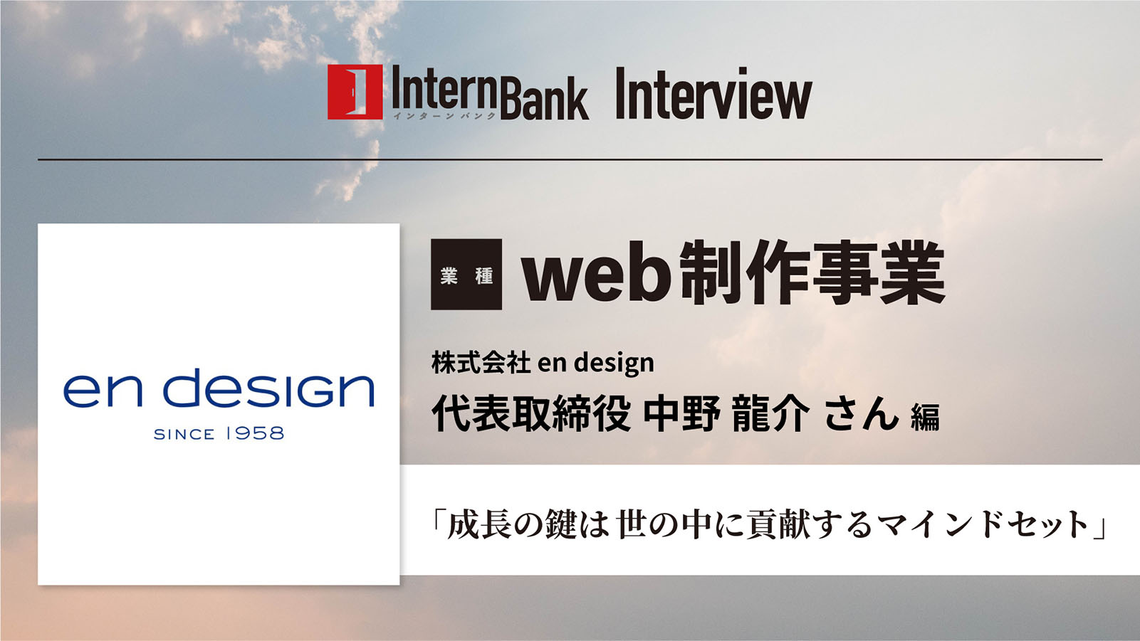 株式会社en designの中野さんのインタビューが公開されました。 2021 8/23 >>株式会社en design 企業ページ >>インターンバンク公式Youtube よかったらシェアしてね! URL Copied! URL Copied! 株式会社阿部モータースの阿部さんのインタビューが公開されました。 FlamingJune合同会社の下島さんのインタビューが公開されました。 この記事を書いた人 internbank編集部 現役インターン生を中心に活動しています。現役大学生ならではの視点、インターン活動を通じて気がついたこと、より深く知りたくなったことを積極発信していきます。 関連記事 人気のマーケティングのインターンて?仕事内容や身に付くスキルなど 2022年8月31日 短期インターンと長期インターン、参加するならどっち? 2022年3月1日 大人気の広告業界!インターン参加前に知っておきたい3つのポイント 2022年1月9日 プログラミングのインターンには文系や未経験でも参加できる?特徴や身に付くスキルなど 2022年12月6日 社会人もインターンに参加できる?学生向けインターンとの違いやメリットなどについてご紹介 2022年3月24日 「オータムインターン」に参加してみよう。倍率が低めの秋が狙い目! 2022年11月8日 ライターのインターンにも種類がある?仕事内容や身に付くスキルなど 2022年9月29日 営業のインターンとは 2021年7月15日